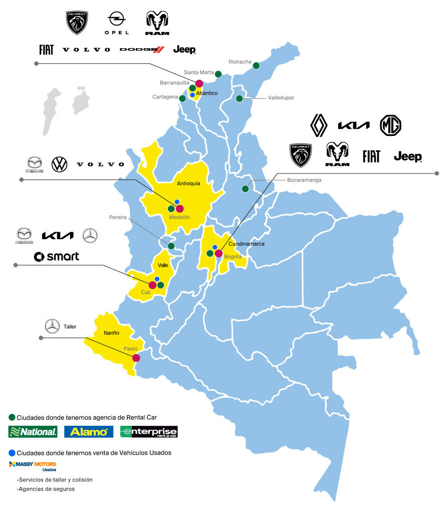 Somos parte de Massy Group, un conglomerado con más de 100 años de historia y operaciones en más de 60 compañías en el Caribe, Centroamérica y Sudamérica. El grupo ha construido una reputación basada en la integridad, el servicio excepcional y la creación de valor sostenible. En Colombia operamos desde 2014, consolidándonos como una compañía referente en el sector automotor, representando 14 marcas de prestigio internacional, incluyendo Kia, Mazda, Mercedes-Benz, Renault, Volvo, Peugeot, RAM, Fiat, Jeep, Volkswagen, Opel, MG, Smart y Dodge.