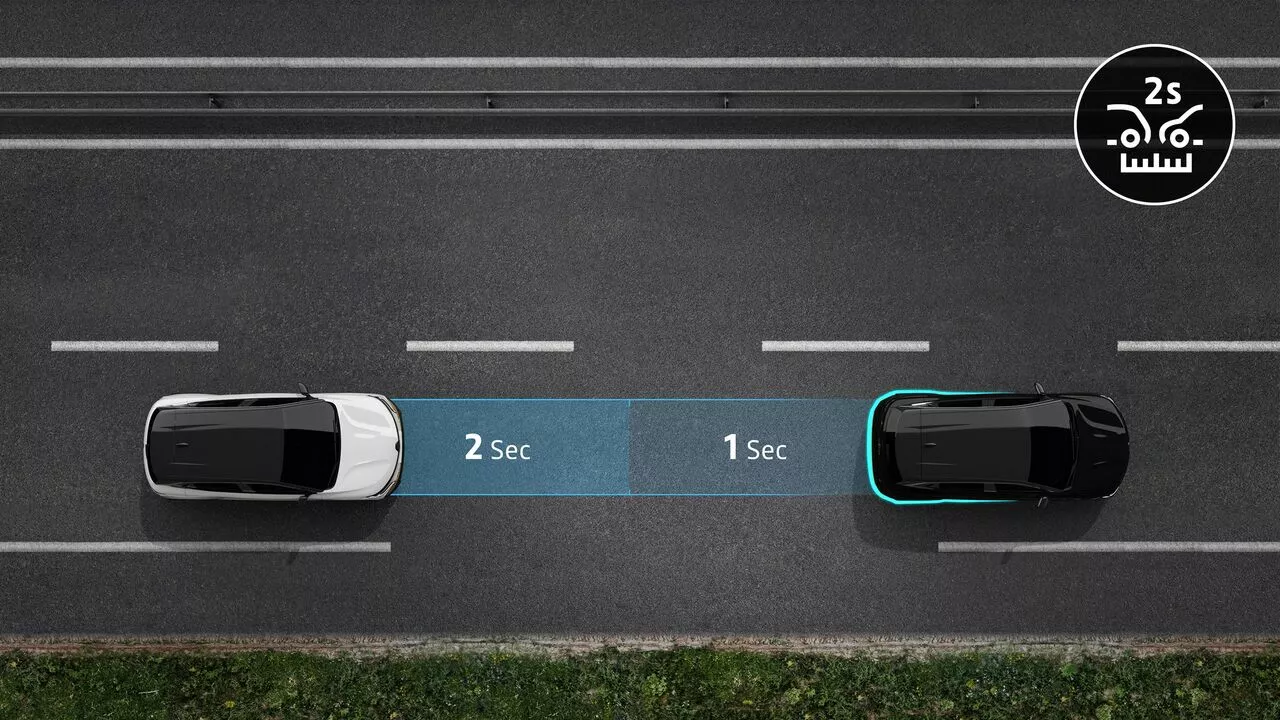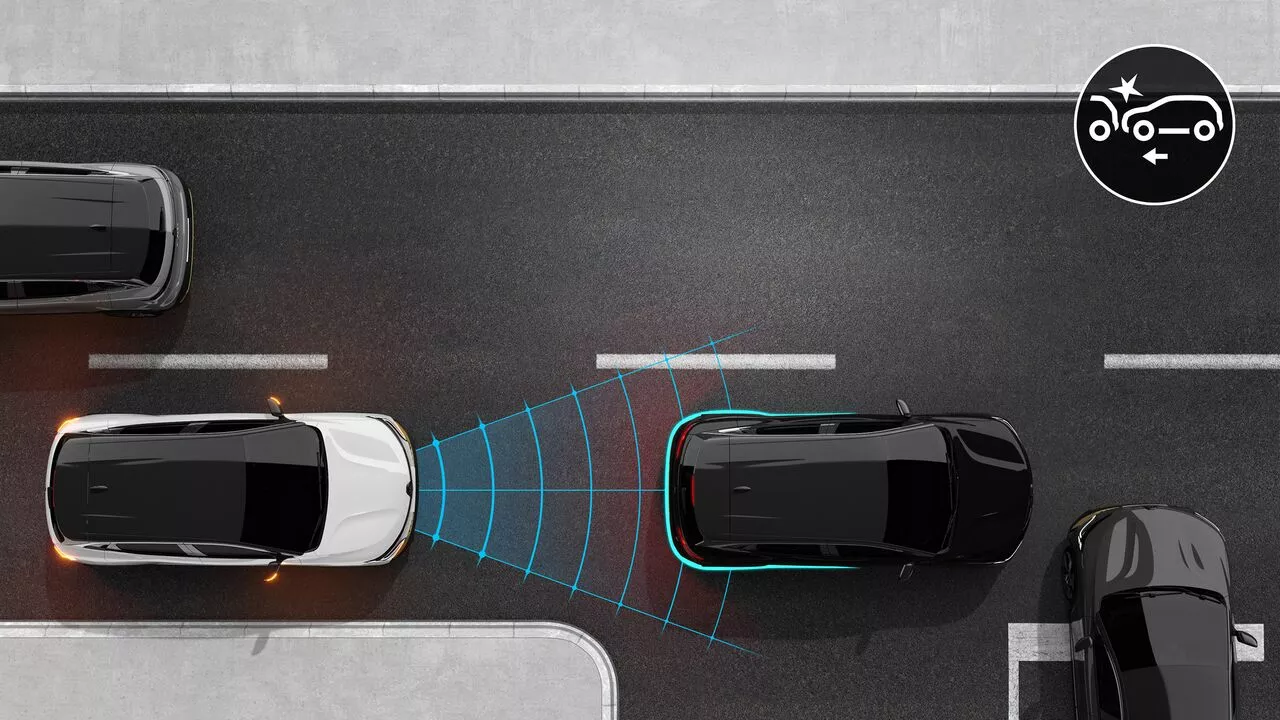 un sensor situado en la parte delantera del vehículo calcula la distancia de seguridad con respecto al vehículo que circula delante. En caso de riesgo de colisión, el sistema emite un aviso sonoro y visual.